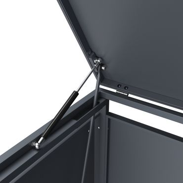Dank der eingebauten Gasdruckfedern lassen sich die Boxen ganz einfach öffnen und schließen. Die mitgelieferten Zugseile ermöglichen das Öffnen der Mülltonne durchs Öffnen des Deckels. Dank einer hochwertigen Pulverbeschichtung ist die Mülltonnenbox optisch ein Highlight und überzeugt durch ihr hochwertiges und modernes Design.